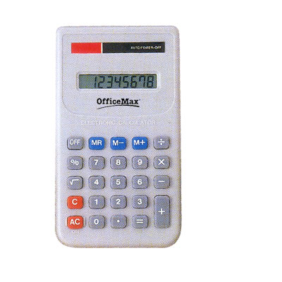 Hand-held pocket 8 digit calculator with raised rubber keys.